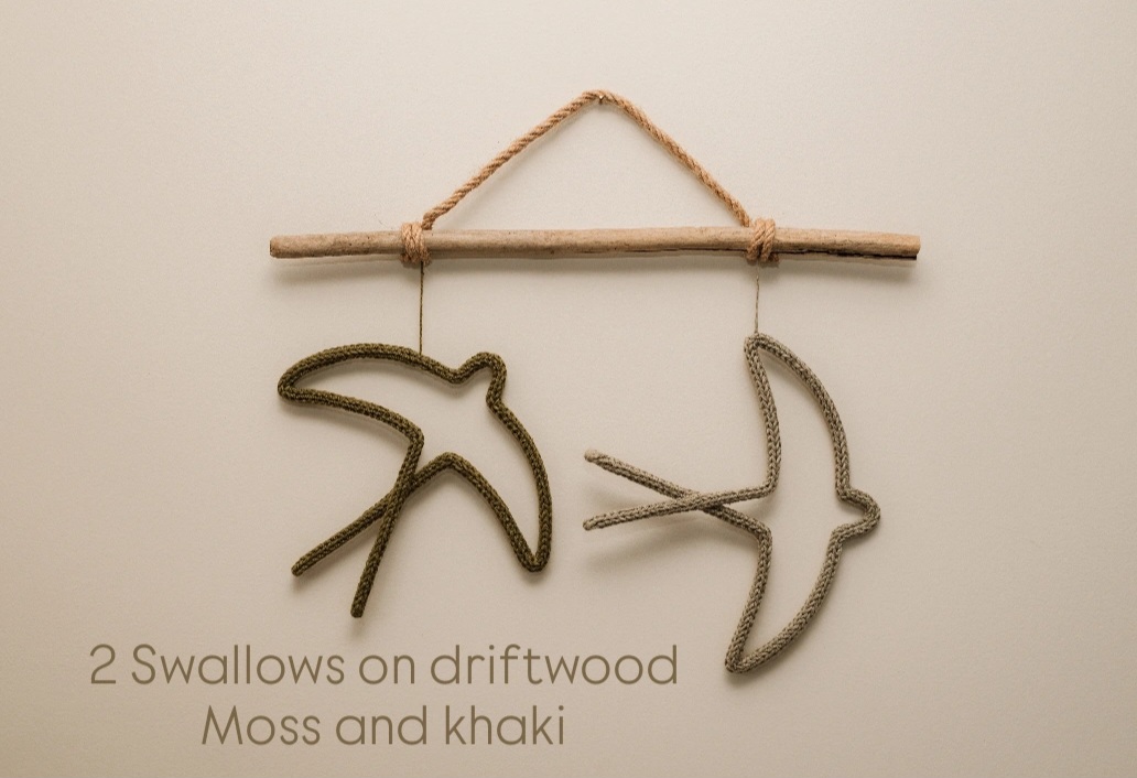 Lastly, we have the mini hanging swallows. 2 smaller birds hanging from a piece of driftwood. These can be made to match, or 2 different colours.